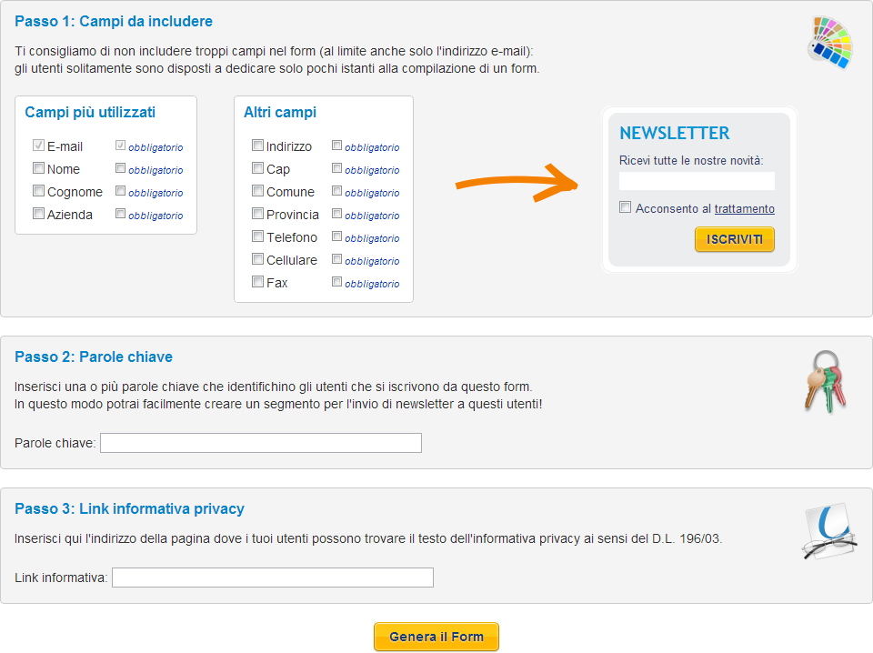 Da Contatto Web è possibile generare un form da inserire nel proprio sito web, in modo da acquisire in modo automatico il database dei contatti: semplice e molto efficace!
