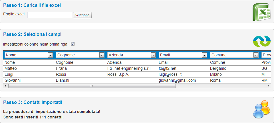 Una volta abbinati i campi, il gioco è fatto: si preme un bottone ed ecco che tutti i contatti sono già in Contatto Web, pronti per ricevere tutte le Vostre comunicazioni via e-mail o SMS.