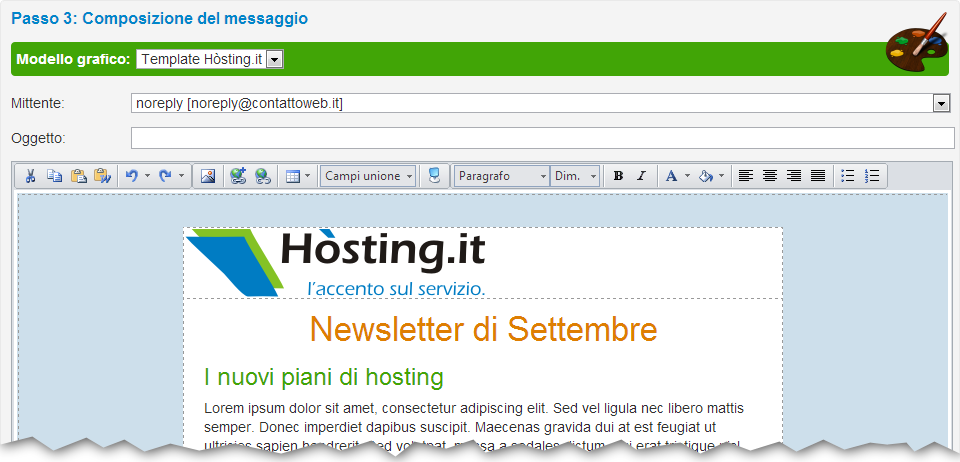 A questo punto si può scegliere il modello grafico, il mittente e l'oggetto, per poi procedere con la composizione del messaggio da inviare.