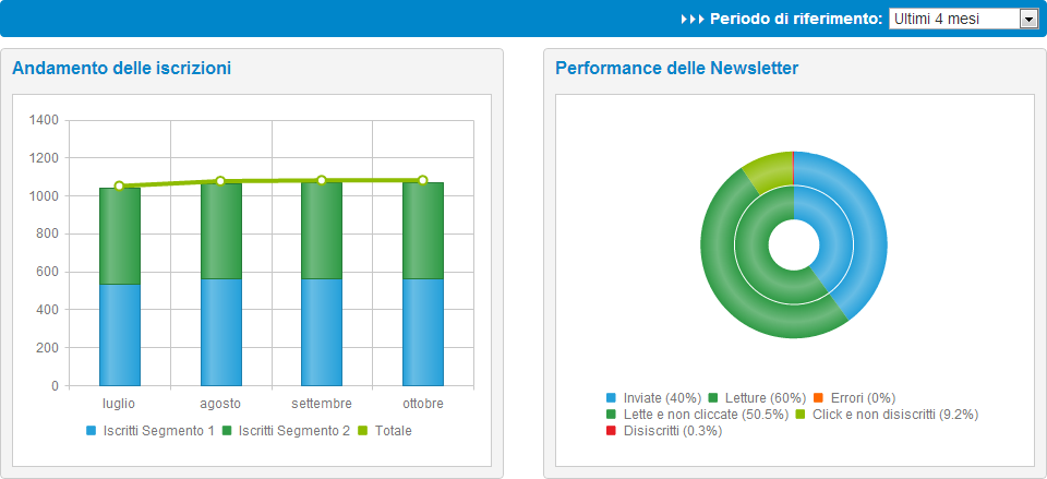 Appena entrati in Contatto Web avrete subito a disposizione il Pannello generale, con due grafici molto utili: l'andamento delle iscrizioni alla newsletter nel tempo e la performance delle newsletter inviate.