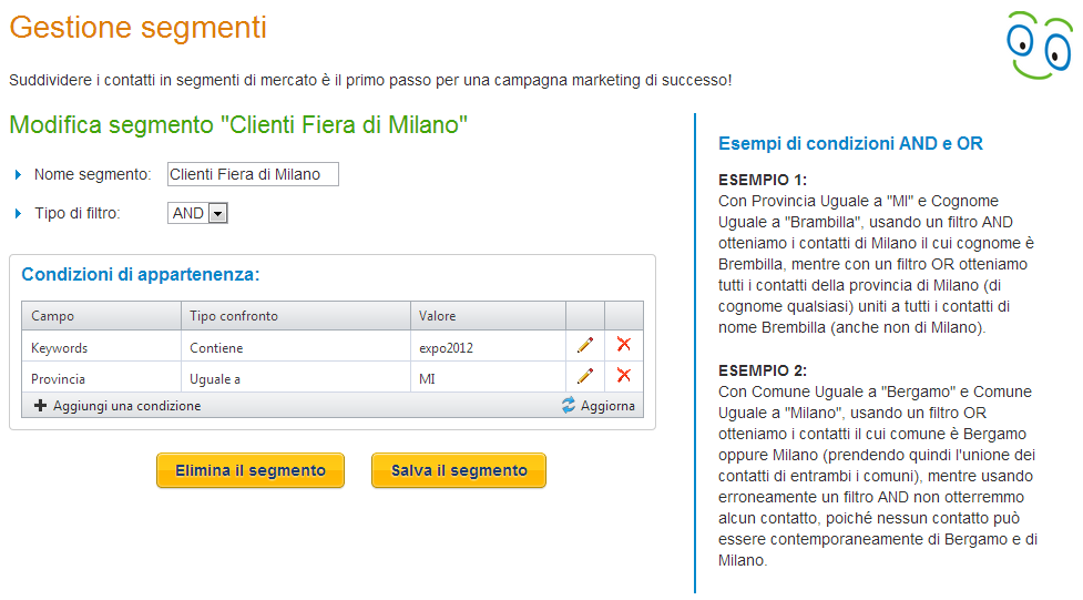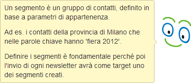 Piuttosto che specificare l'appartenenza ad un gruppo per ciascun contatto, la suddivisione in segmenti è molto più potente: creando un segmento sulla base delle caratteristiche richieste (ad es. utenti della provincia di Milano), anche i nuovi utenti di Milano che si iscriveranno saranno assegnati automaticamente al segmento!