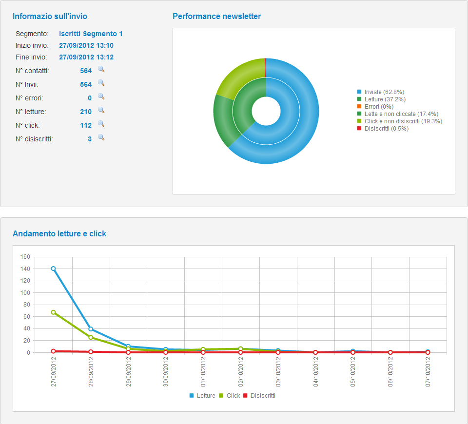 Il primo grafico mostra il numero di e-mail inviate, lette, cliccate e gli eventuali errori di invio.